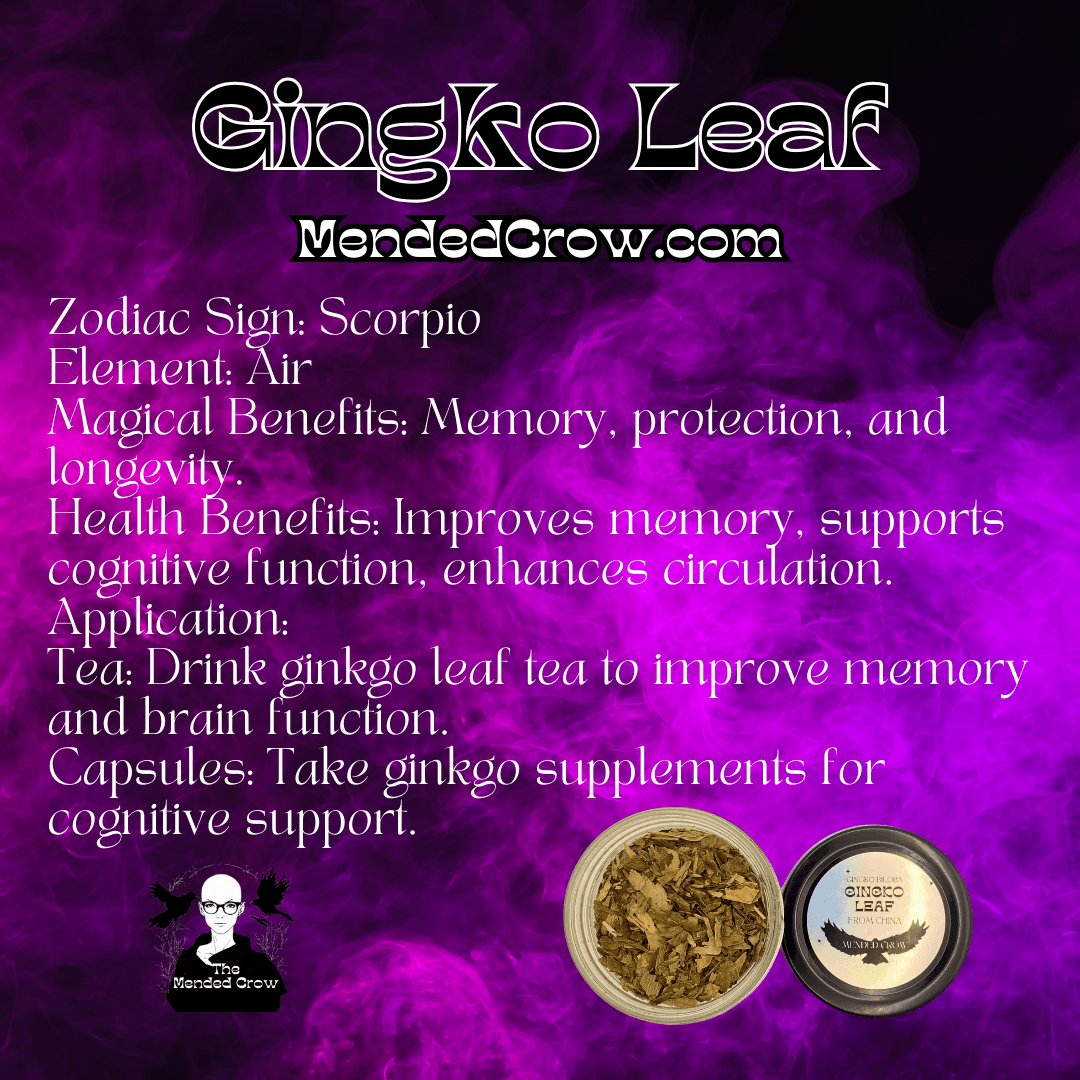 💨 Air – Ginkgo’s association with the Air element enhances mental clarity, communication, and inspiration, making it a perfect herb for unlocking the mind and embracing new ideas.