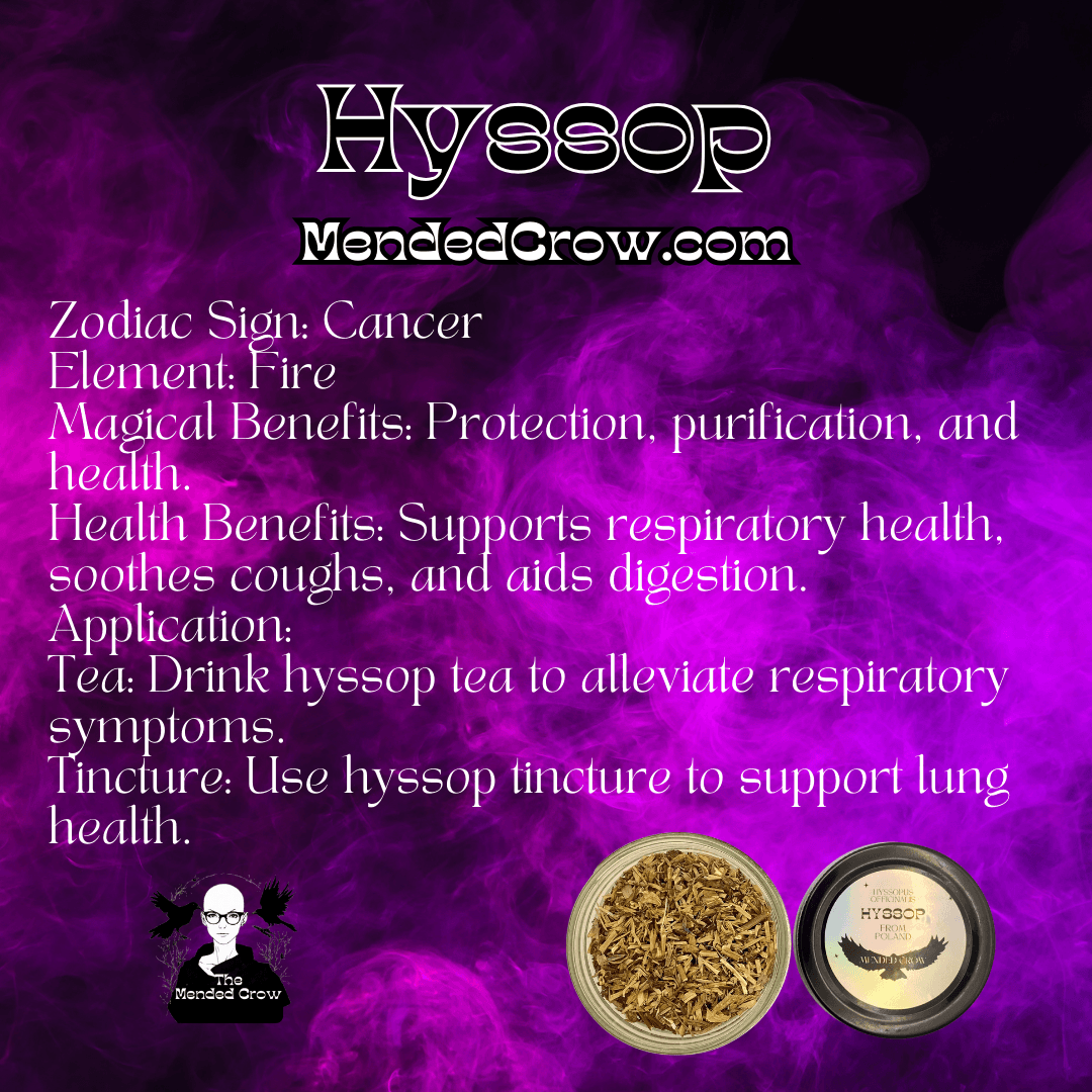 Step into the ancient wisdom of Hyssop, a powerful herb known for its purifying and protective energies. This sacred plant has been used in magickal practices for centuries to cleanse the aura, purify spaces, and guard against negative energies. Revered for its spiritual potency, Hyssop is often used in sacred rituals and baths to promote healing, protection, and emotional release.
